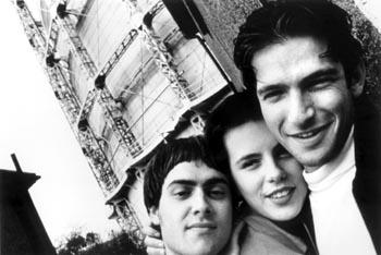 To a soundtrack of neo-'60s pop, two zany guys, American slicker Dylan (the sub-Dennis Leary comic Dan Futterman) and nerdy genius Jez (Stewart Townsend), work a number of hustles on staid Londoners. They live in a gadget-filled home that's the kookiest house in the Home Counties: a six-story natural-gas tank that looks as if it had been fixed up by Peter Greenaway. The two men are low-key rivals for Georgie (as in Georgy Girl), played by the gamine-coiffed, toothy Kate Beckinsale. Together, the three commit various scams: sales of a voice-activated computer that turns out to be nothing but a cardboard box and a microphone.