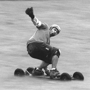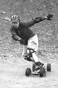 With a wad of mud still packed in my mouth, I receive words of encouragement from Baker. He tells me to keep straight, not get fancy and watch out for the speed-wobbles. I have to take his advice for two reasons. One, my feet are attached to a mountain board, a thing that throws a person downhill very fast; and two, he's reputed to be the best mountain-boarder in the valley, so he knows what the hell he's talking about.