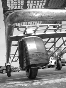 IN APRIL, Webb's Safeway installed a front-wheel clamping system that activates when a cart is wheeled over a yellow spray-painted line. Webb figures since he's been manager, he's lost 50 to 100 carts every six months due to theft. Since Webb installed CAPS (Cart Anti-Theft Protection System) on 150 of his 200-cart stock, not one of the protected carts has disappeared. Of the 50 unprotected carts, 35 have been stolen.