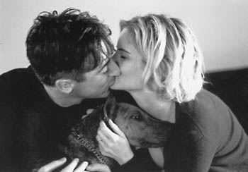 Pooch and Smooch: Alan Cumming and Jennifer Jason Leigh lean over Otis the dog for a kiss in 'The Anniversary Party.'