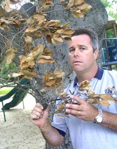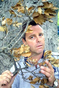 The disease killing these trees is referred to as sudden oak death. Its cause is a new species of the pathogen Phytophthora. This pathogen, which is related to the one that caused the Irish potato famine in the 19th century, is a brown algae that functions like a fungus. "It colonizes the bark of the tree, eats that bark and basically kills tissue," explains Brice McPherson, a postdoctoral researcher in entomology at UC-Berkeley. "It shuts down the means that these trees have to nutrients."