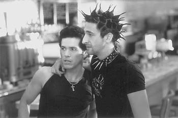 John Leguizamo plays Vinny, who is too promiscuous to stay married to his wife (Mira Sorvino) and too Catholic to divorce her. Sorvino's nigh-hydraulic whine is activated by this bad treatment, though she gamely dons a Dynel wig and goes to the famous swinging club Plato's Retreat to please her husband. (Naturally, she doesn't enjoy it: this is a '90s movie.) Meanwhile, since the Son of Sam is shooting up the Bronx, a group of vigilante Italians confer under a road sign reading "Dead End" (profound!). The local Mafia boss (Ben Gazzara) frowns into his drink and vows revenge. Suspicion falls on the Bronx's only punk rocker, Ritchie (Adrien Brody, late of The Thin Red Line).
