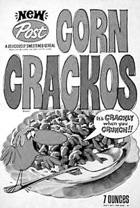 And this is as it should be. What Biter regrets about our domestic flood of generic cereal is that there are no mascots. Take for instance, Nutty Nuggets, Safeway's faux-version of Grape Nuts ("My father was so stupid he thought Grape Nuts was a venereal disease"--Dom DeLuise.). It might shift more units if it screamed "fun!" to the key market. How about the slogan "They're wild, they're crrrrrazy, they're Nutty Nuggets!" And for their boxes, how about a group of mentally challenged superheroes: Captain Wacky, the Gibber, Multipersonality Man and so forth. We can blue-sky some others.