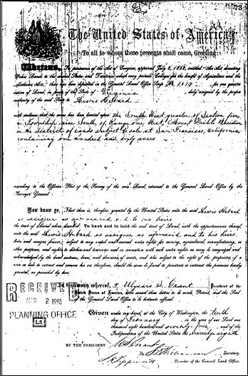NOT LONG AFTER acquiring the property, Arlie hired Velmir Sulic, a local land consultant, to dig up century-old land patents, one of them signed by Ulysses S. Grant in 1875, to help Arlie create 13 more lots than already were zoned for the property. These lots are much smaller than any subdivision scheme would otherwise create. According to ads run by its real estate company, Acosta Commercial Real Estate Services, Arlie is applying for 16 additional lots using this technique. If approved they would raise the total number of developable parcels to 54.