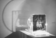 Shown in a narrow rectangular strip that fit on the right side of the building's pediment, the 15-minute loop, accompanied by Steve Durie's soundscape, was a non-narrative, black-and-white montage. Spectral negative silhouettes danced behind "frames" of superimposed black columns while computer-animated images of a figure or flexing hand skimmed the foreground. Floating text, stuttered and blurred digital abstracts, and rapid-fire letters varied the visual rhythms.