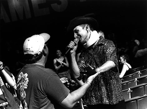 James' Tim Booth slaps five to a lucky Shoreline fan. Booth spent half the set testing the reach of the cordless microphone, serenading concert goers and providing an early Lollapalooza highlight. (50k)