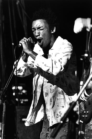Tricky, the trip-hop kid from Bristol, in a moment frozen. His head wobbled and waved as if watching a tennis match on fast forward. Read about Tricky's January show at Club Townsend. (50k)