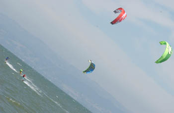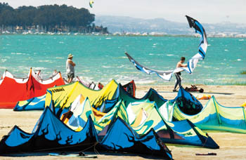 The 7-foot Cabrinha-brand kite unfurls as its ribs inflate. By 2:30, the setup site is packed with fluttering kites alongside windsurf sails that litter the carpet like translucent dragonfly wings. The inevitable friendly dog, drunk with exercise, careers through the clutter. Third Avenue excels as a kiteboarding and windsurfing havenand as a venue for King of the Baybecause of the relative shallowness of the bay here, which warms up the water a little, and the reputed steadiness of the thermal winds that barrel down San Francisco airport. Looking northwest, Candlestick Park hazes in the distance. To the southeast, Dumbarton Bridge arcs away, and airplanes drone low overhead at irregular intervals, sending larger sail-shaped shadows over scalloped bay waters.