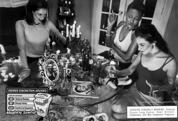 The ad depicts a candle-filled room with three twentysomething women sitting around a glass table, poking pins in a voodoo doll. Books on Paganism are tucked into the image, covered in dripping wax and obscured by a pack of Camels. In the middle of the table stands a crystal ball. Two of the women have smokes wedged between their fingers.