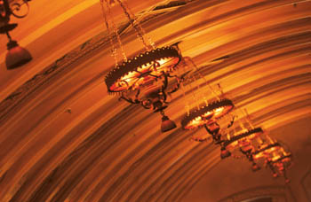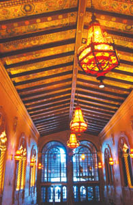 In the main lobby, the crowd will enter over adobe and blood-red hand-cast tiles. Above them are raised beams, covered with painted rosettes and dogwood flowers, interspaced with the theater's original floral frescoes, restored. Twisted Corinithian half-columns line the walls. This timbered lobby ceiling matches the raised beams in the auditorium, which are a new addition to the original design. The raised beams inside the auditorium conceal a necessary evil: the black metal "cans" of hanging spotlights are recessed into them.