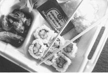 Aesthetics aside, Shin Sushi's lunch special is affordable ($4.95) and brought quick and hot to your table, leaving career persons with ample time to digest before heading back the office. The lunch specials come in three variations: Choice A brings an order of chicken teriyaki, kushi katsu and four pieces of California roll with rice, soup and salad. An abridged version of the first option, choice B comes with chicken teriyaki, six pieces of California roll, soup, salad and rice. Choice C is a large bowl of chicken teri donburi with soup.