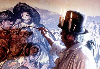 The film looks staged and would probably work better as live theater. The use of transparent walls and backdrops increases the artificiality, which, Saura proposes, is Goya's legacy as a painter. The film ends with a quote by Andre Malraux: "After Goya, modern painting begins." But this erstwhile modernist bio film, weaving back in forth randomly in time, gives us nothing but familiar dioramas and scenes. As might be anticipated, for its finale, Goya in Bordeaux presents us with re-enacted scenes from the artist's engravings Horrors of War, atrocities he witnessed during the brutal guerrilla war between the Spanish forces and Napoleon's army. Watching these tableaux of corpses, dead trees, dogs and howling wind, I started to get moist-eyed. Then I realizing that what was moving me wasn't the movie but the memory of seeing Horrors of War exhibited at the Norton Simon Museum in Pasadena, decades ago. The power of this film comes directly from the power of Goya's art; it evinces no similar power to reflect it.