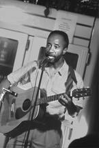A YOUNG MAN takes the stage. With sad eyes intent on a woman sitting by herself, he dedicates a number to her (evidently a recent ex-girlfriend by the lyrics of his ballad. "Forgive me. ... My mistake hurts you. ... Please come back." Tears well up in her eyes. When the song is over, she gives him a smile that may be promising and sweeps out of the cafe. The applause doesn't matter to him. Eyes on the door, he says, "I just need a place to play, man. And this is it."