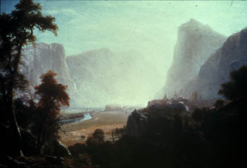 Check In the Mountains again. What appears at first to be Yosemite Valley turns out to be a bit of legerdemain: that's El Capitan, sort of, on the left, but don't try to hit the trail head based on this painting. Bierstadt was aiming for an archetype, not a topo. He wanted to evoke for his Eastern audiences the awe that the first European visitors experienced when they encountered these natural cathedrals of granite.