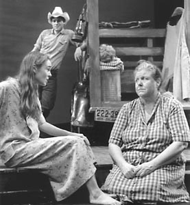 Folk/bluegrass musicians provide background music and make the transitions between scenes. Tom Langguth's set designs are beautifully spare, with rough planks on the stage and lonely silhouettes of farmland scenes forming a vast--almost sinister--backdrop. Echoing the earthiness of farmwork, this production is steeped in the elements: mounds of dirt appear from a hole "dug" in the stage; to simulate a river, the actors wade in a sizable pool of water built into the edge of the stage; and a rainstorm actually drenches the stage. But oddly enough, with such hyperrealism, the production becomes a bit unreal. These devices--though brilliantly executed--seem artificial, and in a sense, make too lavish a gesture for a story about abject poverty.