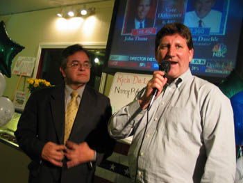 Election night in Palo Alto was a night of contrasts. Stately cocktail drinking versus something that resembled a college tailgate party; style and pizzazz versus old-fashioned earthiness. Milk chocolate bars with the candidate's name stamped on them versus homemade goodies on paper plates. However, the little guyIra Ruskin, in this casewas looking to take home the prize. At midnight, his campaign staff boasted to Fly that he was ahead by four points, but his opponent had yet to concede. That opponent for District 21's assembly seat, Steve Poizner, was the same Steve Poizner who spent $5.8 million of his own gelt to run. Predictably, the candidates' parties were strikingly dissimilar. Poizner's gala was held at Palo Alto's Sheraton. Ruskin was headquartered out of the shabby Democratic Party offices just three miles down the road, next to Happy Donuts, Ernie's Liquors and Coin Wash, a local laundromat. At about 7:30pm, the Sheraton's Oak Room was still relatively empty, and Poizner supporters didn't start trickling in until close to 8. The chef for the evening, Frenchman Pierre Arcè, however, prepared a spread that ran somewhere in the the $15,000-plus range. Starbucks coffee, soda (tiny glass bottles of Coke and Sprite), water was free; alcohol required producing a wallet with some money in it. The treats for Poizner's supporters included a platter of local cheesesgoat cheese, Brie, gorgonzola, Monterey Jack, sliced fruit, Italian brouette, grilled Portobello mushrooms, smoked trout on cucumber, canapé with Brie and Napa Valley grapes, Dungeness crab salad, California sushi with pickled ginger, sea scallops wrapped with turkey bacon, coconut beer battered prawns with mango chutney and a carving station with prime rib. Down the road, Ruskin's group chowed down on KFC out of cartons, crackers, chips and salsa, and beer drunk from cans or plastic cups. DJing for Poizner was Raffi Nalvarian, an Armenian-American better known as King Raffi of Mix 106.5. It was Nalvarian's first political gig and he wasn't about to get partisan. "The bottom line is that whoever wins, their supporters are going to be happy," King Raffi told Fly when asked if Republicans party better than Democrats. "If Poizner wins, then the people here will be tearing it up." A little later, he did concede a degree of political ambivalence: "I was tired of both Bush and Kerry," he said. "I was saying on the radio, wouldn't it be a lot easier if kids ran the country?" Others at the event weren't as hesitant in taking some digs. "We're not at Barbara Boxer's party," said David Douglas, a health care venture capitalist. "That's a botox party. They're probably giving Botox injections over there." Jerry Lami, owner of Mulligan's Pub & Grill in Redwood City and an old friend of Poizner's, nodded his head in agreement. "The guy [Poizner] is a billionaire," Lami gushed. "He's got a billion dollars sitting in the bank, and I'm guessing he's making $100 million dollars a year just off the interest." Joe Simitian, easily winning a state senate seat, ambled into the party at about 9:30pm to a rousing round of applause and whistles. Minutes before, Ruskin, himself, entered the scene, but melted into the background, waiting for a Poizner concession. Simitian, sporting a golden tie, looked visibly drained. "I'm ready to call it a day," he admitted. Did he party or work more on Election Day? "I spent most of my day thanking people," Simitian cleverly responded.