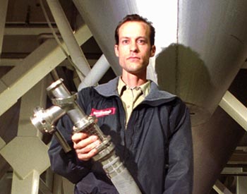 Kruse looks like he's stradding one as he transfers the fresh brew from a three-story cylindrical kettle, clad in corrugated steel, into a storage tank. He clasps a thick hose, as heavy and unruly as a boa constrictor, between his legs and aims its mouth toward the floor. Eventually, beer gushes out and Kruse attaches its base to the new tank's inlet valve, and then the beer swoops up into the tank's stainless belly. It takes four brews, at seven hours cooking time each, to fill one mammoth tank. The brew sits there for 40 days lagering, or being stored--an alcoholic Noah's ark.