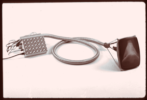 Although these objects reveal his obvious love of electronics, they also focus on the darker side of our obsession with computers--an obsession that in most cases has little to do with any sort of quest for knowledge. As net heads everywhere know, online chat-room traffic often takes place with one hand on the keyboard and the other in the lap. Tongue Tied, an accretion of twisted cables and electronic boxes that hangs in a beautiful state of equipoise, comments on that phenomena.