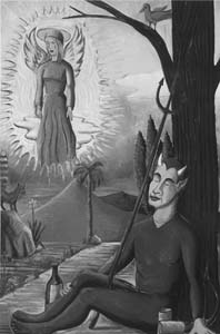 A WRY, INVERTED RIFF on "Devil With the Blue Dress," Dreaming of a Blue Angel shows a sleeping red devil resting his pitchfork and pointy tail against a bare tree. The apparition of Satan's unobtainable desire floats in a Day-Glo sunset sky borrowed from a black-velvet painting.