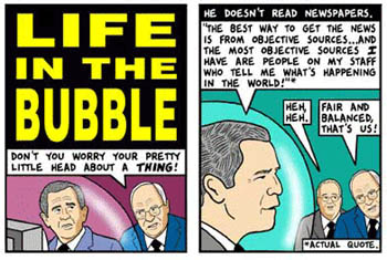 President Bush lives in a similar cocoonor at least we discovered in 2005 that Americans believe that he does. And why shouldn't they? He goes about life in a carefully controlled environment where he's spoon-fed information from handlers Karl Rove, Dick Cheney, Condoleezza Rice and Donald Rumsfeld. Inside the bubble, he's sealed off from distasteful things like "opposing viewpoints," "real people" and "grieving parents of dead soldiers." And like the Boy in the Plastic Bubble, Bush's public appearances are as scripted as made-for-TV events held before hand-picked, sympathetic crowds on military bases and Republican strongholds.