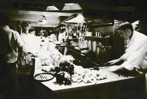 Another memorable entree came from the sacred hearth of Chez Panisse, involving spit-roasted rib-eye carved into rare slices and lavishly dusted with black truffles. The aroma rising from the plate was intoxicating all by itself, thanks to the effective use of the prized truffle, a brilliant partner for beef. Sharing honors with the fine beef was a gathering of tiny winter vegetables, turnips the size of a thumbnail, sweet carrots, pearl onions, golden chanterelles and hearts of artichoke. All those perfumes of the January garden were catalyzed by a garnish of baby cress and a fat pillow of ultrarich potato soufflé. If, by this point in the meal, I had run out of the Rhône wine, I'd switch to a 1993 Central Coast Syrah from Qupé.