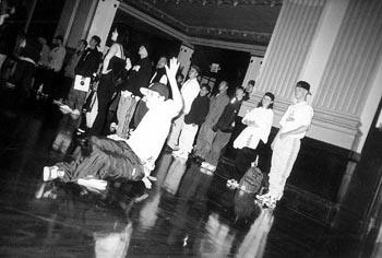 A small, ponytailed, lightly mustachioed boy spinning on his head in a corner was all of 15 years old. Calling himself "Amoe One," he's a member of the Ego Smashers Crew, a group of six break dancers that, this being 1998, happily included one girl, 20-year-old Lady J. Amoe One said his brother taught him to break dance on his ninth birthday. "I'll be doing it till I'm 40, till my legs fall off," he says. His crew has started traveling around the country and will soon be competing in L.A.
