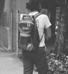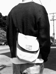 Why carry the typical tricolored double-wide? Courier bags are popular, and this one by Manhattan Portage is unlike most seen on the MUNI. Big enough to hold a jacket and a magazine, yet it's still small enough to pass as a purse (allowing you to ignore the "check your bags" law that rules retail).