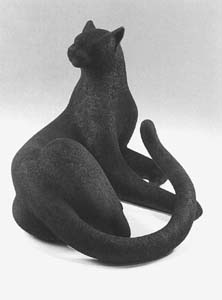 Southern California sculptor Gwynn Murrill adores animals of all kinds, as her current solo show attests. She creates an entire menagerie of stylized creatures cast in bronze: some languish about the gallery space as if alive while others stand on pedestals. Although Murrill seems most enamored of felines, the show also includes dogs, horses and birds. In Bronze Dog (1990), Murrill perfectly captures the form of a giant sleeping canine. It lies directly on the gallery floor, made of the smoothest black bronze, all details erased until it becomes the essence of everydog. Similarly, Burmese Cat (1998) presents the figure of an archetypal animal, vaguely Egyptian in style. The small silver-plated cat stands stick straight with an almost taxidermied stiffness. Once again, the particulars of the cat's appearance are left out in favor of a more streamlined shape. Out of this quotidian subject matter, Murrill extracts an elegant study in form and line.