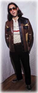 DJ Cut-n-Paste of Folsom Street Fair fame wears suspenders and an undershirt beneath a double-breasted black pinstripe blazer plucked from Goodwill. Well-worn Doc Martins and seven earrings round out his look.