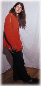 Brett Snyder of the Richmond, an actor and day-care worker, wears a red cotton sweater (Goodwill, $1), a necklace made "from stuff I found on the street," purple nail polish, blue cords and sandals made of recycled tire treads.