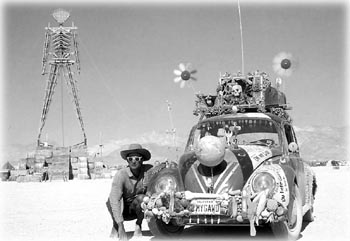 Herrod Blank's progress toward becoming the leading chronicler of the art car began when he was 16, he tells me. We stood next to a hedge of flowering dry-climate plants in the driveway of his dad's house in the Berkeley foothills. Parked in front of the house was Blank's well-known ride "OHMYGOD": a multicolored mid-sixties VW Beetle crowned with a nest of objects making the car 10 feet high. "OHMYGOD" is equipped with electric spinning plastic lawn daisies, a mailbox and a beach-ball-sized globe fastened on the hood. Blank is lean and tall, a devoted basketball player in college. For a man who drives one of the most flamboyant cars in California, he doesn't have a joker's personality.