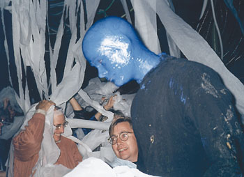 They mix high technology with popular culture and in the process create a bigger mess than a cafeteria food fight. The troupe's 80-minute theater piece is littered with volcanic eruptions of paint, Twinkie cream, Jell-o, video cameras, crepe paper and, of course, blue makeup. The pranksters are known for such gags as enticing audience members onto the stage for a banquet of Twinkies or encasing one hapless person's head in a mold of orange Jell-o.