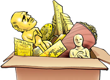 By this time next year, with any luck, some enterprising individual will have snapped it up and reinvented the Product Placements Awards (What should they be called? The Crassies?), and will be using them to spread their own unique view of the universe. Along with those, you can be sure, there will have arisen several other new awards as well, all jostling for a moment in the Awards Culture spotlight. Because, just as with the Oscars--or the Emmys or the Grammys or any of the others--winning the damn trophy is not what's truly important. In the end, what really drives all these award-giving/award-collecting endeavors, be they large or small, is probably not anyone's fundamental desire to win-win-win; more likely, it's nothing more than our incessant human craving--that basic, underlying, ever-present need--simply to be noticed.