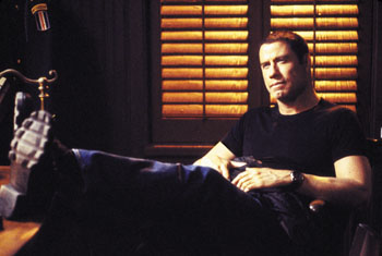 It's Thursday, Feb. 18, 2003--Travolta's 49th consecutive celebration of his own birth--and the big day has been a butt-kickingly busy one for the energetic birthday boy. Since early morning, the one-time TV Sweat Hog has been doing back-to-back interviews, working against the clock to promote his new movie--John McTiernan's sneaky, military-themed whodunnit Basic--before he's due on a movie set in Baltimore to film Touchstone's big-budget fire-fighting epic Ladder 49 with Joaquin Phoenix and Robert Patrick.