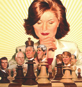 "Arianna," he said with the enchanting optimism of an 11-year-old, "I'm going to convince you that you should support Bush in November. Here are two questions you have to answer. The first question is: Are you for more or less taxes? The second question is: Do you want to fight the war on terrorism?"