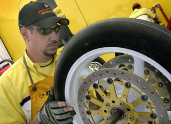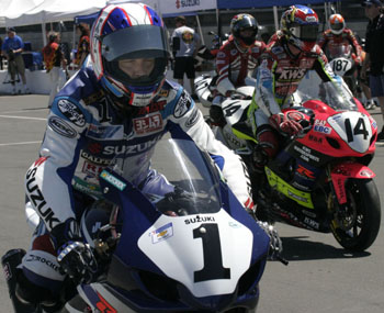 Motorcycle manufacturers have a saying: "What wins on Sunday sells on Monday." Duhamel's Honda, aside from a few trick engine and suspension components allowed by the rules, is identical--right down to its paint scheme--to the CBR1000RR sold in Honda shops. Same goes for current AMA Superbike champ Matt Mladin's factory GSXR1000 Suzuki, Eric Bostrom's factory Ducati 999S and Josh Hayes' factory Kawasaki Ninja ZX-10R. Santa Rosa privateer James Randolph turns up on what was essentially a stock Yamaha YZF-R1 with suspension modifications and the lights stripped off of it.