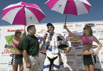Standing on the podium with Zemke and Yates, who passed Mladin near the end to finish third, Duhamel refuses to take credit for the victory, instead thanking his Honda mechanics and plain old racing luck. He dedicates the win to the U.S. armed forces serving in Iraq. Duhamel, Zemke and Yates uncork bottles of champagne and spray the parched crowd with bubbly. Then, the small gold crucifix around his neck glinting brilliantly in the sun, Duhamel rides a red Honda scooter back to the paddock, where mechanics are preparing his Formula Xtreme bike for the day's final race.