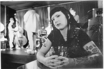 MS. OLIVE, 28, is six feet tall with six piercings in her lip. Actually, she's got six small holes, because she took the piercings out a few years ago. Her hair is jet-black and down to her waist, braided into rags about a half-inch thick. Across her knuckles is tattooed the motto "LIVE FREE." By the time your eye has traveled up to her shoulder, it has seen "HELL" (on her wrist), "IRONY" (encased in flames), and a fleet of UFOs swarming between inky planets. The entire "sleeve" has been tattooed with a Swiss-cheese effect so that the whole scene appears to take place under the skin of her arm.