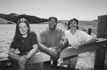 Eye on the prize: Lafferty Access Committee members Laurel Hagan, James Mobley, and Robert Ramirez at the disputed entrance to Lafferty Ranch, a city-owned parcel that remains a civic battleground.