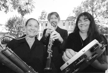 Bringing down the house: Musicians Lynne Dubin, Daniel Celidore, and Marie Gonzalez gear up for the Petaluma Summer Music Festival, while behind them one of the locations for the festival's Music in the Mansions series bides its time.