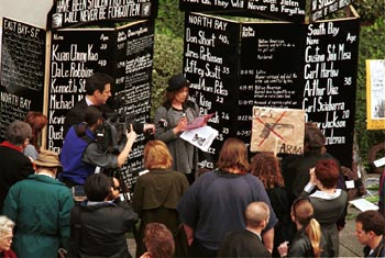 Deadly toll: Outside the 1998 U.S. Civil Rights Commission hearing, demonstrators erected a makeshift memorial to those killed in police-involved incidents.