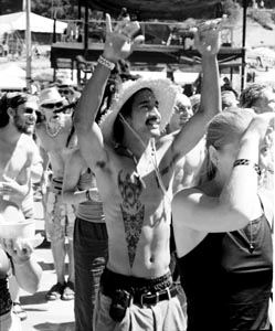WE CRUISED UP and down the rocky camping and parking area, the happening place of the evening, and wound up at a school bus with history. Founded a few years back by the Wicked Crew, a collective of Bay Area house DJs who've since become too well known to bother playing reggae, the bus announces its destination above the windshield as HEAVEN. After grooving out to amazing Jamaican DJs, we returned to camp to regroup and collect more beer. The girls decided to stay at camp for a relaxing evening around the keg, and the fellas went out to have an "I can party harder than you can" testosterone competition.