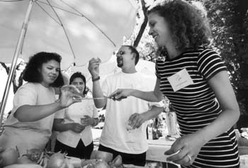 AFTER SOOTHING our chipotle-charred palates with some sweet butter on bread, we sit down for lunch. There are 36 chefs, mostly from Sonoma County, a few from Napa and San Francisco, who pair up talents to feed over 400 people. At a table full of well-heeled people whose eyes I can't see through their sunglasses we end up eating lamb sausage shishes and, for dessert, a crunchy but oh-so-good baked apple on brandied currant toast with lavender-scented ice cream. I want to talk with the sausage maker, who is seated on the other side of the table, but it would be impolite to yell. We content ourselves with enthusiastic dining and a spirited critique of our table partners' jewelry and prissy eating habits. (Just pick the toast up with your fingers, dammit!)