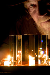The prisms are embedded in resin. When a votive candle is placed between the prisms and lit, the result is a candle flame reflected eight or more times, generating a remarkable amount of light as it bounces back and forth among the reflective glass, casting spectral shadows and rainbow images onto the wall, the ceiling, all around the room. At the moment, in Standard's darkened room, there are 10 of the things going--each lit with a candle apiece--generating as much light as a hundred candles.
