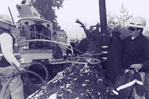 High-wire act: On Wednesday, line crews in Forestville cleared felled trees. High winds knocked out phones and 80,000 county customers lost power.