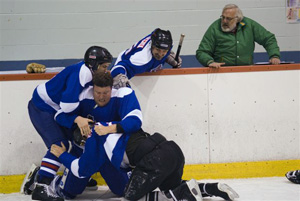 (Canada; 96 min.) It's one thing for a mockumentary to be inspired by This Is Spinal Tap—they all are, in one way or another—but this Canadian film is practically a retelling. From the opening segment and occasional appearances by the goofy and overzealous documentarian "Gyan Singh" to the plot about an over-the-hill band (of amateur hockey players) limping through their last tour of duty with one more shot at glory, it follows the template at every turn. OK, there's something to be said for stealing from the best, but as Tap themselves used to say, there's a fine line between clever and stupid. The Puck Hogs trips right over it; it has the mockumentary style down but no substance. Worst of all, it's just not very funny. Compare the classic "Stonehenge" or tour-bus gags in Tap to this knee-slapper: one player's gym bag smells up the locker room, and the team finds a dead mouse in it. But the bag still smells worse than the mouse, so they reach in again and find a dead cat. Rim shot? I don't even know. Tap's No. 1 contribution to the genre is probably the idea of fairly stupid people desperately trying to sound smart in interviews, but over the course of any mockumentary, we have to end up caring about the characters for some reason, no matter how dumb they supposedly are. No one on the Puck Hogs team is interesting enough to get behind, and the games themselves are shot so poorly (even the big climax) that it makes hockey look like maybe the most boring game ever devised. That's too bad, since hockey isn't lacking for comedy material. Is Slap Shot the best we're ever gonna get? (SP)
